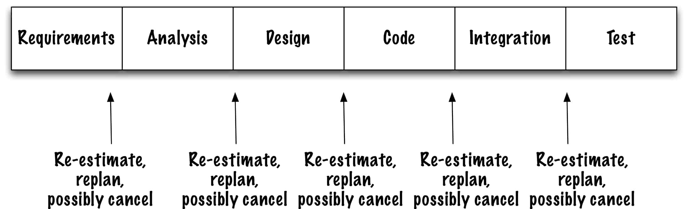 My managers didn’t just cancel projects at the end of the requirements phase. They canceled at the end of Analysis when we chose the architecture. They canceled at the end of Design, too. Especially if we had to revisit the requirements (which we almost always did). That’s because we almost always used Alternative 3, with more feedback loops.